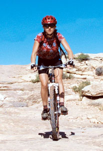 Alison Clarkson rides her mountain bike over slickrock.