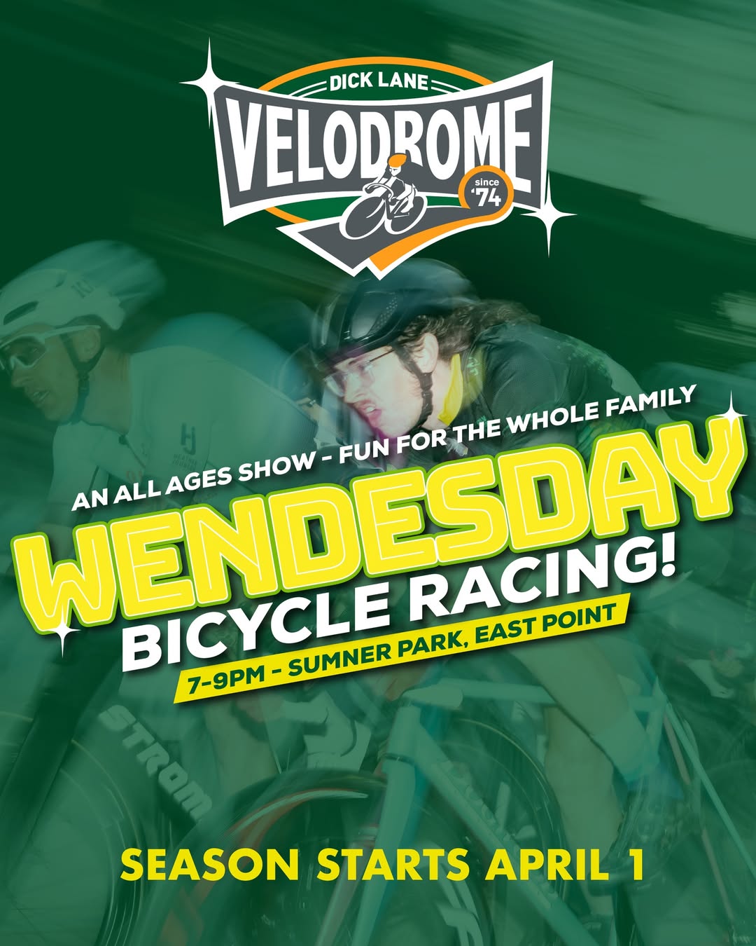 Dick Lane Velodrome Racing Starts! From the DLV Wednesday nights under the lights at the velodrome. Fast, fun, and just the right amount of chaos. Season starts April 1 7–9PM, Free to watch Bring your friends. Bring your family. Please just leave your pets at home. (Trish’s note: City regulations say no pets at the DLV. Not even on a leash.) Dick Lane Velodrome, 1889 Lexington Drive, East Point, GA dicklanevelodrome.com